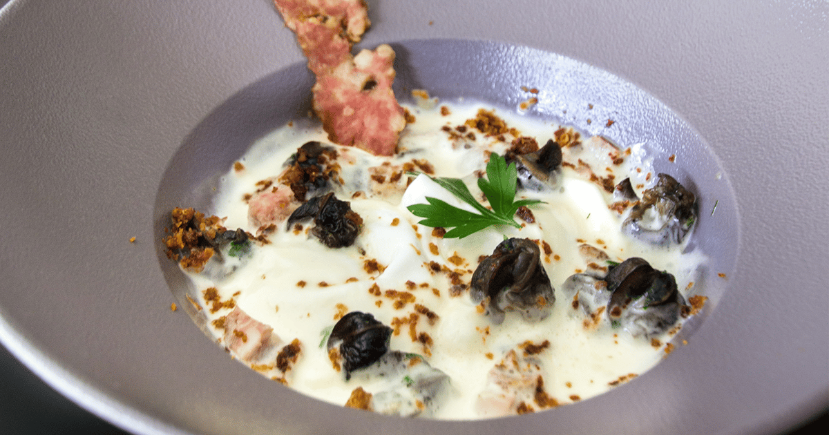 Sécher les œufs pochés réchauffés avec un papier absorbant puis les déposer sur l’assiette, ajouter l’espuma de cancoillotte puis les 12 escargots de notre préparation de façon harmonieuse.